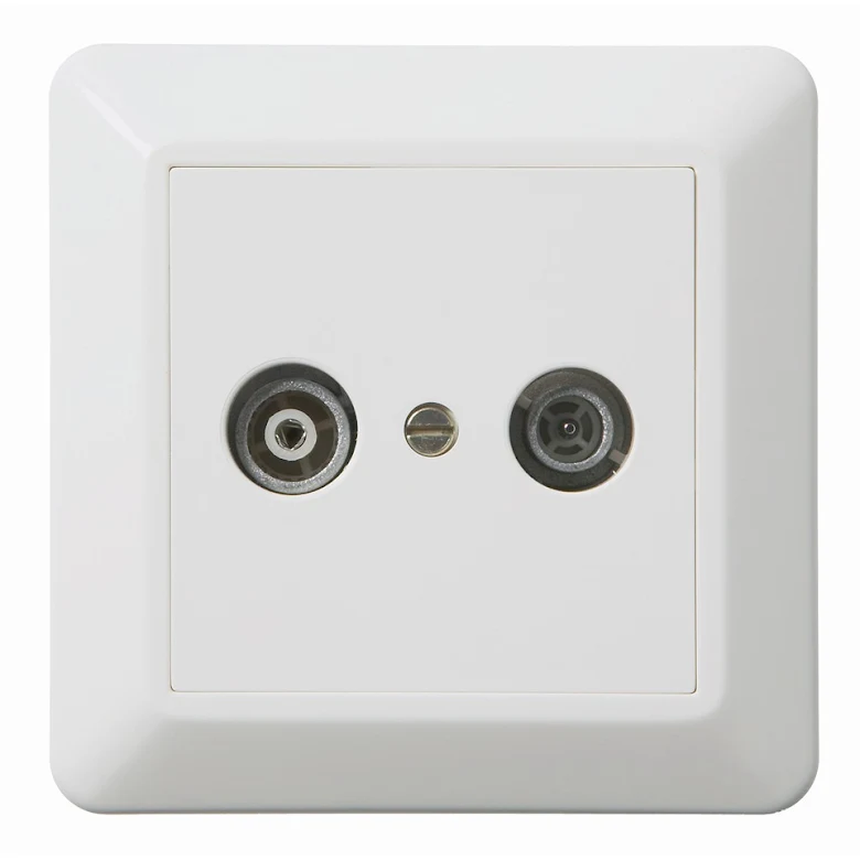 Elko RS Antennuttag, kompletta Radio/TV-uttag inkl. kontaktdon. Satellituttaget är ett slututtag på 3 dB och går inte att seriekoppla. Satellitutgången är en F-kontakt (hona). Centrumplatta och ram av halogenfri termoplast. Passar i apparatdosa med fästskruvavstånd 60 mm och tillsammans med ELKOs kombinationsramar. Vid utanpå-liggande montage användes ELKOs förhöjningsramar. Montagedjup 24 mm.