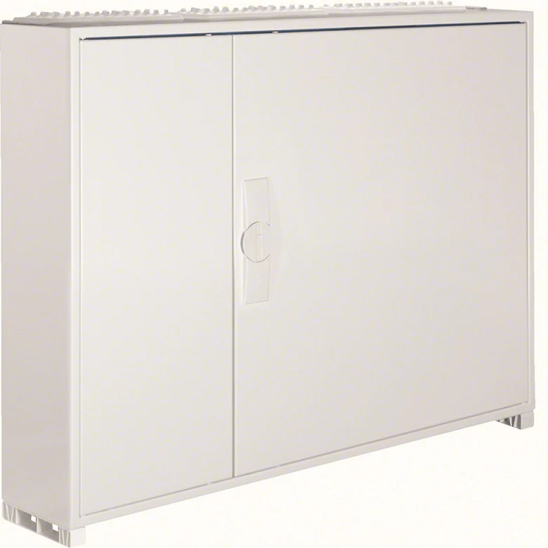 Hager Normskåp FW H650, komplett utanpåliggande kapsling av vitlackerad (RAL9010) plåt med vändbar dörr. Levereras med DIN-skenor, täcklock, flänsar och noll- och jordutrustning. Kapslingsklass IP44. Skåpen går att fälla in med hjälp infällningsram, inköpsram köpes till som tillbehör. Max inkommande 125A.PE/N-skenor ingår med QuickConnect-anslutningar.Ledningsinföringar under/över.Norm: EN 60439-3