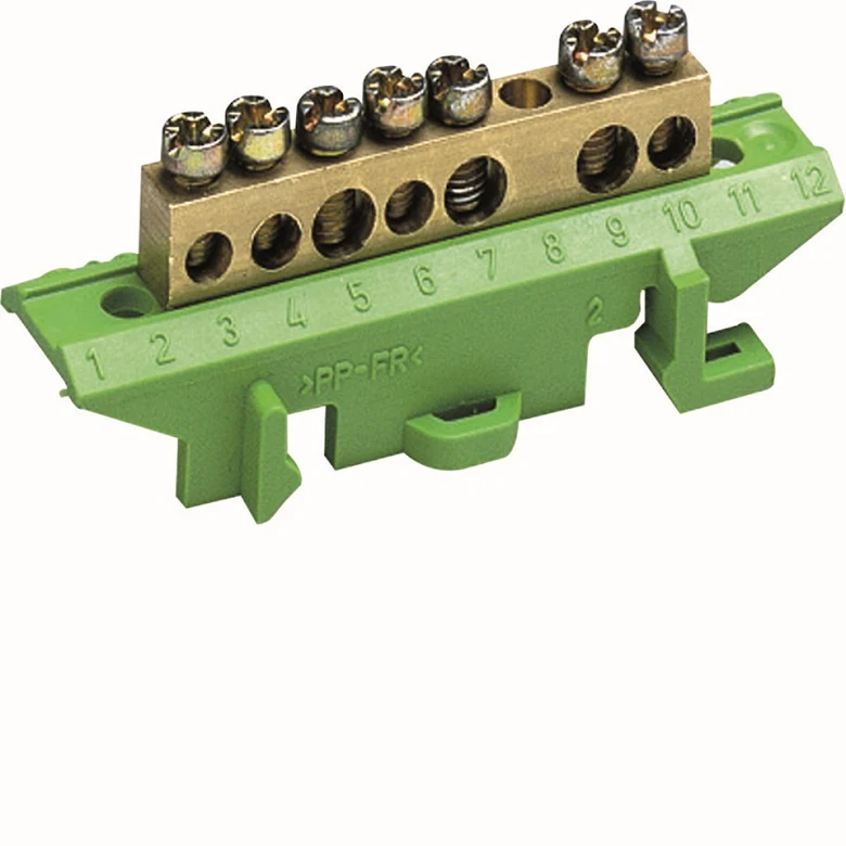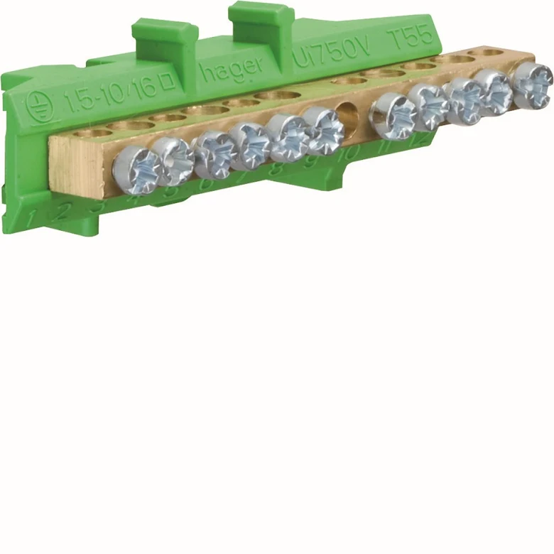 Hager Jordplint PE med snabbfäste för DIN-skena 35mm, 12x2mm skena. Tillverkad för montage i kapsling. Färg: Grön, märkström: 60A.
