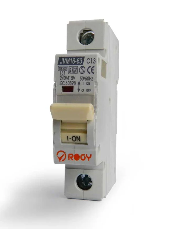 Rogy Automatsäkring 1-pol C-typ 6-40A C-karakteristik "trög", serie JVM16-63. Automatsäkringarna är tillverkade enligt de senaste europanormerna EN 60898 och EN 60947-2. Rogy är andra största tillverkaren i världen av automatsäkringar. Anslutning av dvärgbrytare kan ske med både kabel och fasskena på nedansidan samtidigt, kabel kan även anslutas på ovansidan. Fasskena av gaffel- eller stifttyp går att använda.