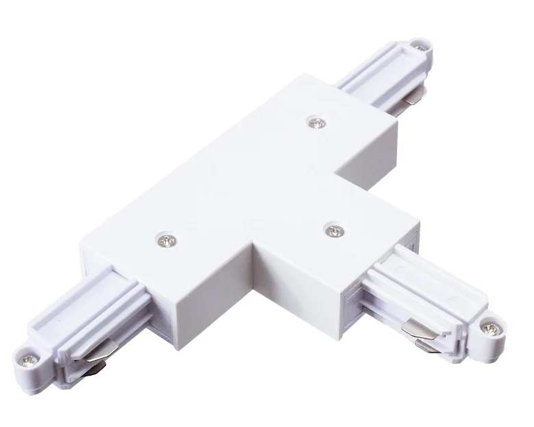 T-Skarv för 1-fasskensystem som passar ihop med 1-fasskenor 230V. Finns i tre olika färgutförande, svart, vit och silver med jord till höger respektive vänster.