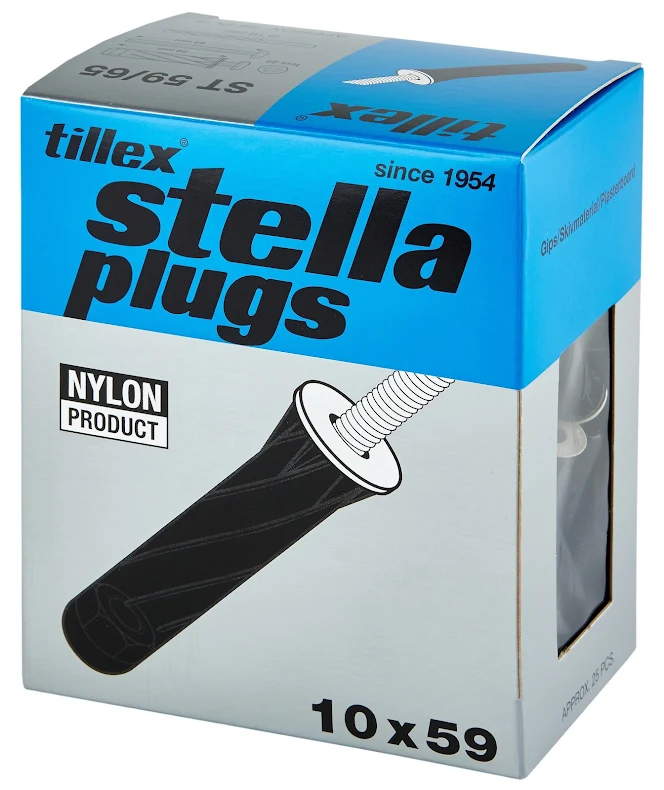 Tillex Stella Skruvplugg är en plugg som gör det enkelt att montera tunga föremål som hyllor, element, överskåp, armaturer, lampor och kanallister på alla sorters plattmaterial med bakomliggande hålrum. Monterar tunga föremål på gipsplattor, spånplattor, masonitplattor, fanérplattor och andra plattor hålrum bakom.